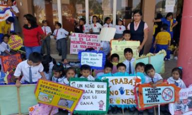 Los pequeños mostraron carteles cuyas frases decían “El trabajo no es cosa de niños”, “La educación es la medicina contra la violencia familiar”, “Hoy decidimos, no hay más maltratos ni más abusos”, “Dile no al trabajo infantil”, “Si se cansan, que sólo sea de jugar”, “Hagamos un trato para erradicar el trabajo infantil”, “No más niños (as) trabajando, los queremos estudiando”, “Un niño que trabaja, pierde más de lo que gana”, entre otros.