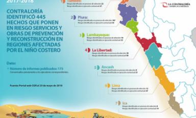 Chiclayo en Línea.- Prosiguiendo con su rol asesor y de acompañamiento al proceso de reconstrucción de las regiones afectadas por el fenómeno de El Niño Costero, la Contraloría General identificó 445 hechos que podrían poner en riesgo servicios y obras implementadas en el marco de la Reconstrucción con Cambios en Tumbes, Piura, Lambayeque, La Libertad, Ancash, Lima e Ica desde setiembre 2017 a mayo de 2018.