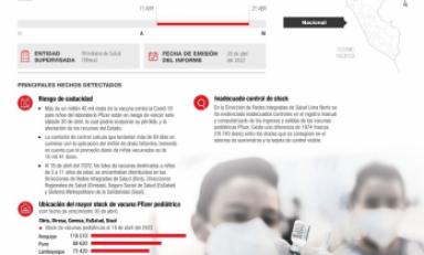 Cabe precisar que la comisión de control visitó el 18 de abril de 2022 las cuatro Direcciones de Redes Integradas de Salud, así como la Dirección Regional de Salud del Callao donde verificó de manera presencial la existencia de 130 mil 860 dosis de vacunas pediátricas Pfizer con fecha de vencimiento 30 de abril, lo cual corrobora el stock de dosis a nivel de Lima Metropolitana y Callao respecto al stock de dosis a nivel nacional.