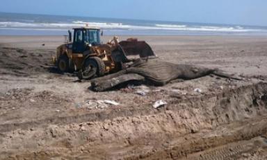 Chiclayo en Línea.- Debido al avanzado estado de putrefacción en que se encontraba fue enterrada la ballena jorobada de 15 toneladas y 12.5 metros de largo, que varó en la playa del distrito de Santa Rosa el último fin de semana.
