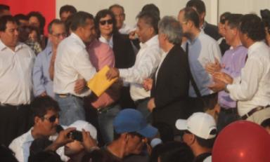 Chiclayo en Línea.- La presencia del presidente Ollanta Humala Tasso en Lambayeque, fue aprovechada por el alcalde de Chiclayo, David Cornejo Chinguel, para solicitarle, por escrito, el apoyo financiero del Estado para varias obras de saneamiento y maquinaria para la provincia.