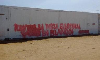 Según se puede apreciar, junto a la palabra Movadef escribieron la frase: "Contra la farsa electoral vote en blanco". Todo ello con pintura roja.
