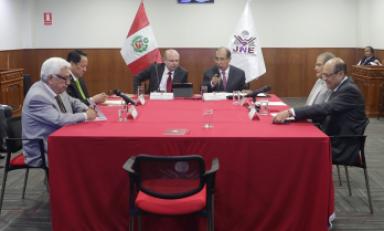 La sesión, presidida por el titular del JNE, Víctor Ticona Postigo, contó con la asistencia del jefe de la Oficina Nacional de Procesos Electorales (ONPE), Manuel Cox Ganoza, así como de directores y jefes de ambas entidades.