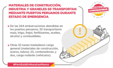 De las 244 embarcaciones que fueron atendidas en las instalaciones marítimas y fluviales del 16 al 22 de marzo durante el Estado de Emergencia, 32 trasladaron carga general; 29, graneles sólidos; 26, graneles líquidos; 25, contenedores; y dos, carga rodante.