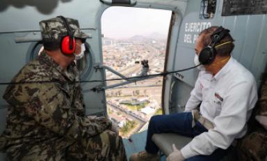 El titular del sector Defensa realizó este sobrevuelo acompañado del jefe del Comando Conjunto de las Fuerzas Armadas, general de ejército César Astudillo Salcedo, y de los comandantes generales del Ejército, general de ejército Jorge Céliz Kuong, y de la Fuerza Aérea, general del aire Rodolfo García Esquerre.