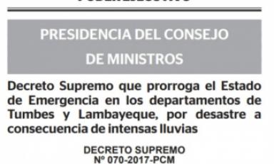 Chiclayo en Línea.- El Ejecutivo prorrogó el estado de emergencia en los departamentos de Tumbes y Lambayeque, a partir del 4 de julio y por un plazo de 60 días, para continuar con la ejecución de acciones y medidas de excepción inmediatas y necesarias de respuesta y rehabilitación que correspondan tras los desastres provocados por las intensas lluvias de El Niño Costero.