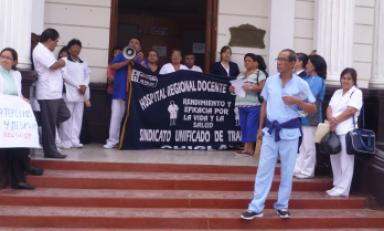 La secretaria del sindicato de enfermeros, Magaly Medina, indicó que el reclamo que vienen realizando los tres sindicatos Unificados de Trabajadores que hay en el nosocomio, es debido al pago de cuatro meses de sueldo, la formalización de contratos de las enfermeras y la salida del director por la mala gestión.