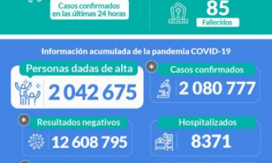 Asimismo, señala que, a la fecha, se han procesado muestras para 14 millones 689,572 personas por la covid-19, obteniéndose, 2 millones 80,777 casos positivos confirmados y 12 millones 608,795 negativos.