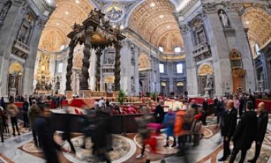 El cuerpo de Joseph Ratzinger yace en un catafalco cubierto por una tela dorada, rodeado por dos guardias suizos vestidos de gala, frente al altar mayor de la basílica dominado por el baldaquino de bronce negro con imponentes columnas retorcidas diseñado por el maestro del barroco Gian Lorenzo Bernini.