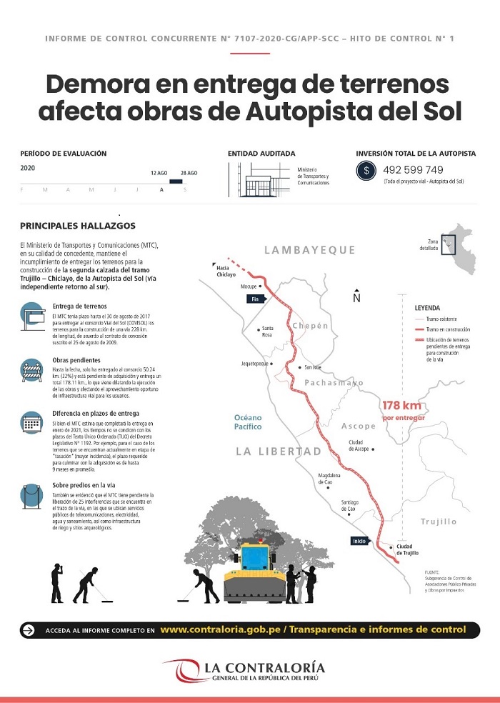 De acuerdo al Informe de Hito de Control N° 7107-2020-CG/APP-SCC (periodo 12 al 28 de agosto de 2020), el MTC tenía plazo hasta el 30 de agosto de 2017 para entregar al concesionario el área de la concesión del tramo Trujillo-Chiclayo (228.35 Km). Sin embargo, se evidenció que hasta la fecha solo entregó 50.24 Km (22%) estando aún pendiente otros 178.11 Km (78%).