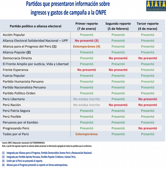 - Los partidos Perú Libertario y Perú Nación no estaban inscritos a la fecha de presentación del primer reporte.