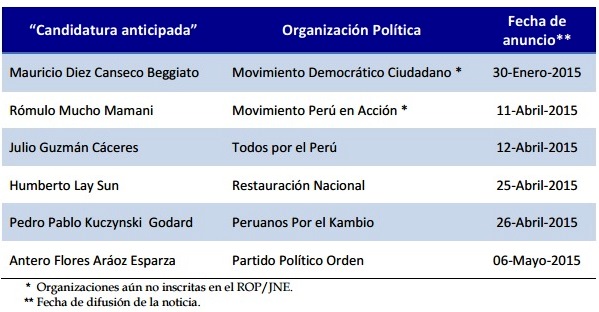 Según señalan estos anuncios se han hecho sin que se haya convocado a las elecciones generales y sin que se haya realizado procesos de elecciones internas en las organizaciones políticas, tal como establece la legislación vigente. El cuadro siguiente muestra el anuncio de candidaturas anticipadas: