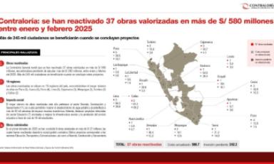 Chiclayo en Línea.- La Contraloría General reveló que, entre enero y febrero del 2025, se han reactivado 37 obras públicas, las cuales están valorizadas en más de S/ 580 millones, encontrándose pendiente de ejecutar más de S/ 242 millones, de acuerdo con la información registrada por las mismas entidades en el Sistema de Información de Obras Públicas (Infobras) y lo recopilado por los Órganos de Control Institucional (OCI), por lo que más de 245 mil ciudadanos se beneficiarán cuando concluyan estas obras.