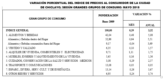 Chiclayo en Línea.- El Instituto Nacional de Estadística e Informática (INEI)- Lambayeque informó que en mayo de este año el Índice de Precios al Consumidor de la Ciudad de Chiclayo registró un alza de 0,39%, tasa menor a la registrada al mes de mayo del 2014 (0,46%).