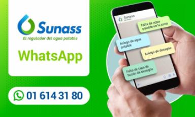 A través de la aplicación WhatsApp los usuarios pueden comunicarse con la Sunass cuando su empresa prestadora del servicio no le haya brindado una respuesta o información oportuna ante emergencias o problemas de tipo operacional como falta de agua en la zona, aniegos de agua y/o desagüe, atoros, rotura de tuberías, trabajos inconclusos, entre otros.
