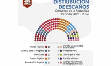 Perú Libre tendrá 37 parlamentarios, lo que implica que será la bancada con mayor número de presentantes; le sigue Fuerza Popular, con 24 legisladores; Acción Popular, con 16 parlamentarios; Alianza para el Progreso, con 15 parlamentarios y Renovación Popular, con 13 congresistas.