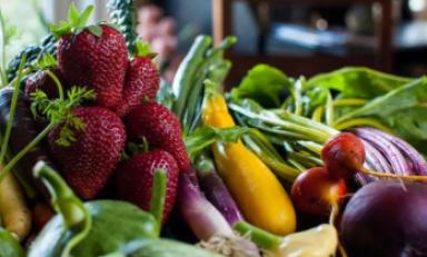 • Vegetales de hojas verdes y frutas coloridas