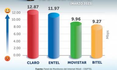 Por tercer mes consecutivo en el 2023, Claro continuó siendo la operadora con mejor desempeño en dicho indicador (12.87 Mbps), seguida de Entel (11.97 Mbps), Movistar (9.96 Mbps) y Bitel (9.27 Mbps), tal como se puede verificar en la herramienta gratuita Checa tu internet móvil, a través de la cual los ciudadanos pueden conocer y comparar directamente el desempeño de la calidad de experiencia del servicio de internet móvil ofrecido por las principales empresas operadoras en su distrito, provincia y región.