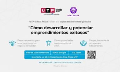 Chiclayo en Línea.- Real Plaza y la Universidad Tecnológica del Perú (UTP) se unen para brindar la capacitación virtual gratuita “Cómo desarrollar y potenciar emprendimientos exitosos”, dirigida a emprendedores del país, de provincias como Piura, Trujillo, Cusco, Cajamarca, Chiclayo, Chimbote, Huancayo, Arequipa, Ica y Lima, para ayudarlos a mejorar e implementar sus negocios.