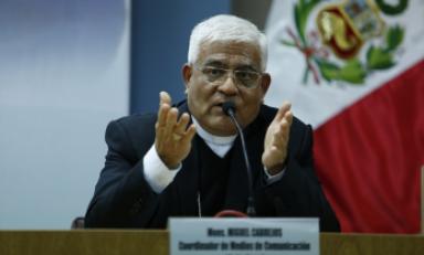 El Cardenal Pedro Barreto Jimeno, Primer Vicepresidente de la Conferencia Episcopal y Arzobispo de Huancayo; Monseñor Norberto Strotmann Hoppe, Secretario General de la Conferencia Episcopal y Obispo de Chosica; Monseñor Salvador Piñeiro García-Calderón, Arzobispo de Ayacucho; y Monseñor Gaetano Galbusera Fumagalli, Obispo de Pucallpa.