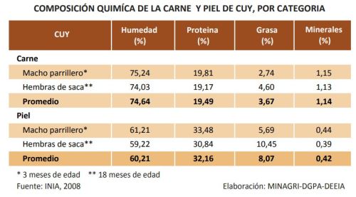 El estudio reveló que la carne de cuy está conformada en promedio por 74.64% de humedad, 19.49% de proteína, 3.67% de grasa, y 1.14% de minerales. Asimismo, la piel de cuy contiene 60.21 % de humedad, 32.2% de proteína, 8.1% de grasa, y 0.4% de minerales. La piel de cuyes jóvenes tiene 2.64% más proteínas que la de los adultos.