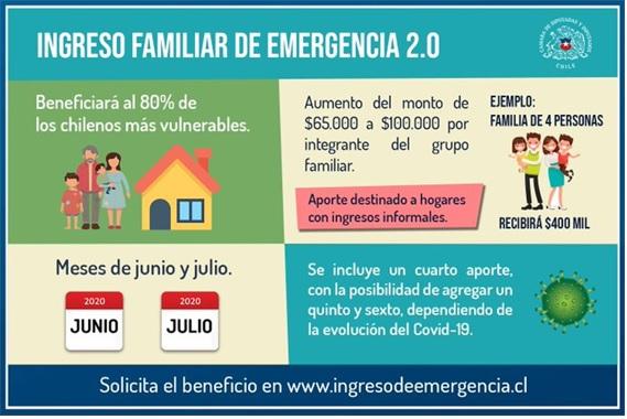 El gobierno chileno creó el Ingreso Familiar de Emergencia (IFE) de 65,000 pesos mensuales, con un máximo de 260,000 pesos para una familia de 4 personas, el equivalente de US$ 320 por mes. Este Primer IFE se pagó durante abril y mayo.