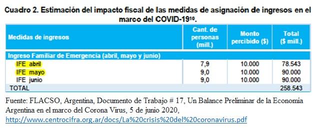 “A la pobreza y desigualdad estructural de la economía se le sumaron actividades nuevas, los nuevos sectores vulnerables por la crisis causada por el COVID. La fragilidad económica en la que se desenvuelven los/as cuentapropistas, personas desocupadas, trabajadores/as informales y trabajadoras de casas particulares excede el contexto de la pandemia. El IFE es, a la vez que una respuesta ante la crisis provocada por la pandemia, una herramienta concreta que permite al Estado dar un primer paso para captar a los/as trabajadores informales, en el camino a ampliar derechos” (Clarín, 12 de junio, https://www.clarin.com/economia/economia/bono-ife-anses-suman-8-846-709-...).
