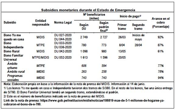 “El padrón del Bono “Yo me quedo en casa” fue aprobado por el MIDIS y utilizó al Sistema de Focalización de Hogares (SISFOH), y el del Bono Rural empleó también esta base de datos junto a la información manejada por el MINAGRI. El Bono Independiente, por su parte, fue focalizado por el MTPE y tuvo que mezclar información de la SUNAT, INEI, SBS, SIS y EsSalud. Procesar toda esta información fue costoso en términos de tiempo, y por ello, se busca ahora crear un Registro Nacional de Hogares a cargo de la RENIEC para consolidar y sistematizar la información de todos los hogares beneficiarios” (ídem, página 92).