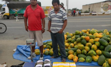 La droga era transportada de manera camuflada en dos bolsas de polietileno y en medio de ocho toneladas de papaya, a bordo de un camión de placa M1A-902, que se desplazaba desde Taparoto con destino a Lima.