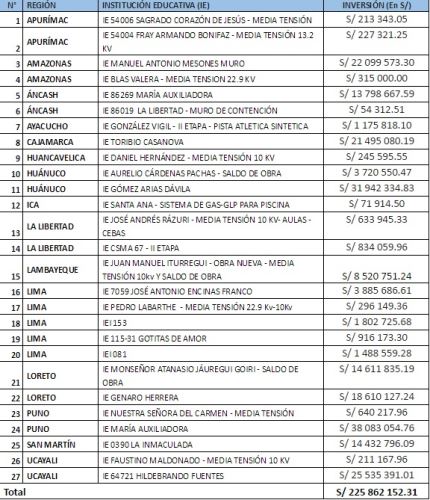 Voceros de la entidad indicaron que los 27 colegios beneficiados están ubicados en las regiones de Apurímac (2 colegios), Amazonas (2), Áncash (2), Ayacucho (1), Cajamarca (1), Huancavelica (1), Huánuco (2), Ica (1), La Libertad (2), Lambayeque (1), Lima (5), Loreto (2), Puno (2), San Martín (1) y Ucayali (2).