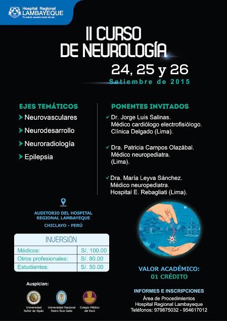 Chiclayo en Línea.- Los días 24, 25 y 26 de setiembre, el Hospital Regional Lambayeque (HRL) se convertirá por segundo año consecutivo en sede del II Curso Nacional de Neurología, evento que reunirá a los principales especialistas de neurología de esta región y de la ciudad de Lima.