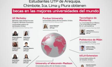 Chiclayo en Línea.- Estudiantes destacados de la Universidad Tecnológica del Perú (UTP) han obtenido becas para realizar estudios en algunas de las mejores universidades del mundo, según los rankings internacionales más prestigiosos. Ellos pertenecen a los campus en Arequipa, Chimbote, Ica, Lima y Piura.